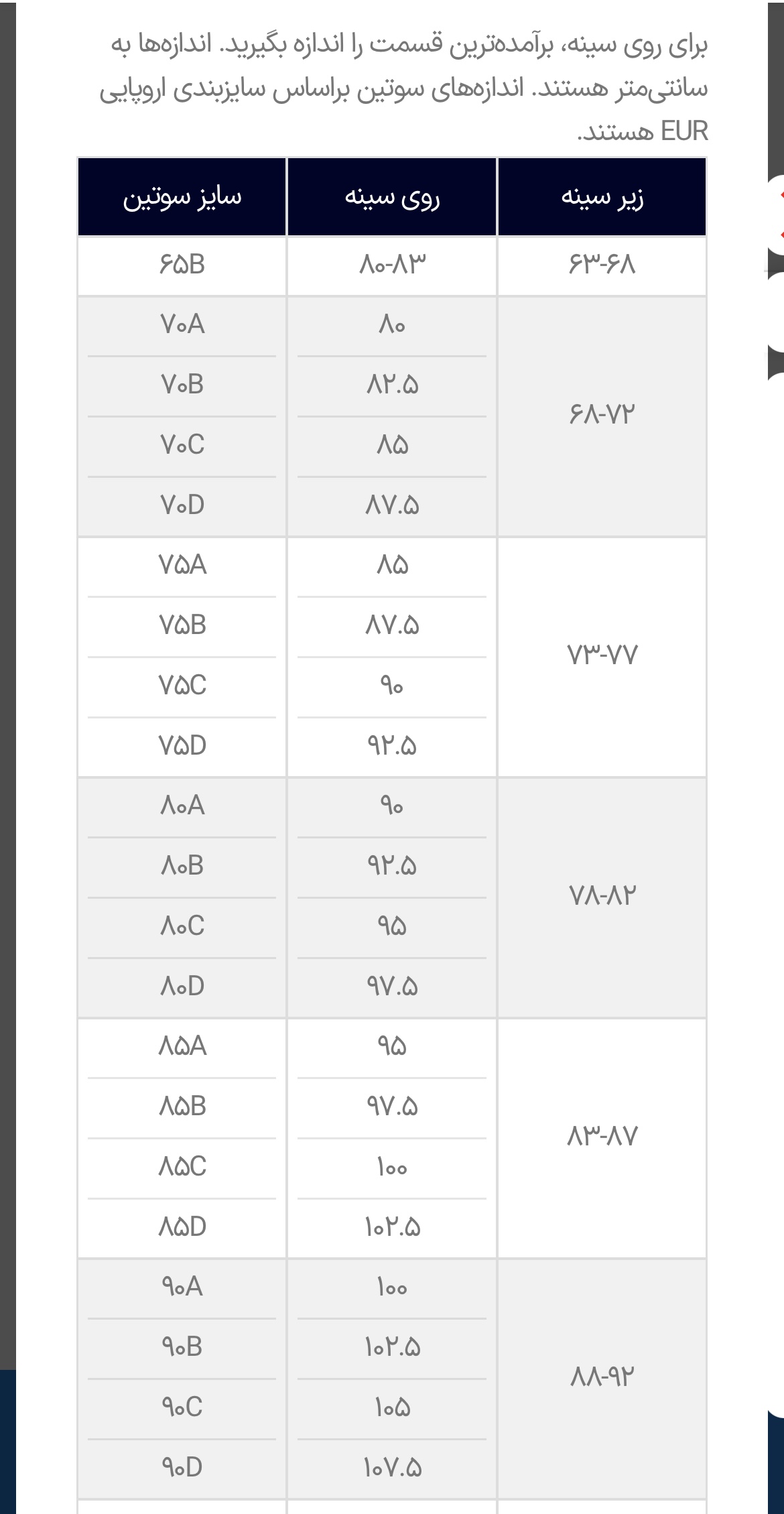 اندازه های گرفته شده را در جدول سایز قرار دهید تا سایز مناسب خود را به دست آورید.
